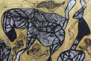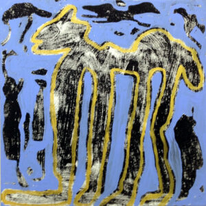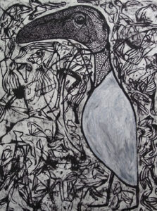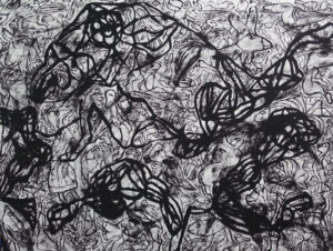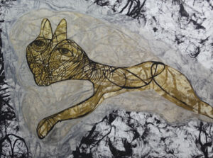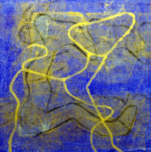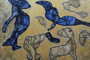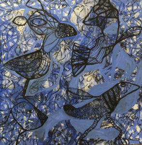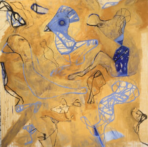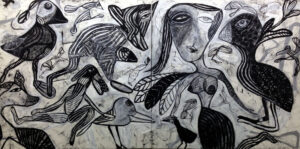 Así también sucede con su pintura. Sus poderosas imágenes se desbordan en la tela en una grafía que, como el agua que fluye, va cubriendo todos los espacios posibles con su pulsión, fundando nuevos universos a su paso.