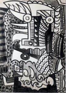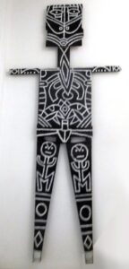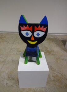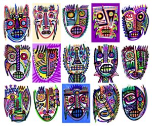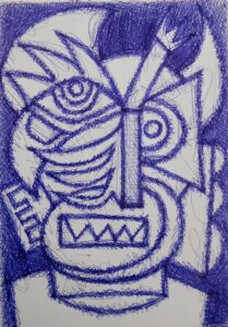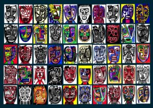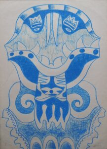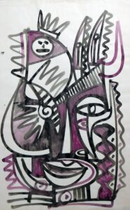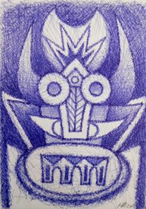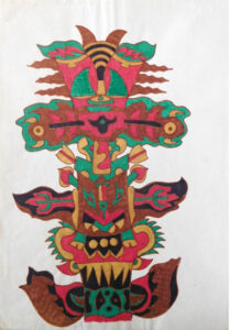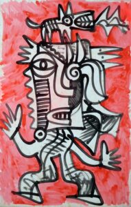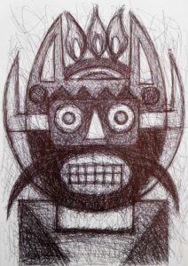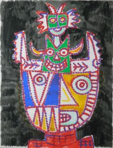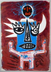 La muestra reúne 63 obras entre tintas, acrílicos, collages, dibujos, esculturas y ensamblajes en diversos formatos y conformados en 3 conjuntos. El primer conjunto reúne obras tempranas siendo la más antigua “Signos” de 1978, en la que se destaca la influencia de la abstracción geométrica de Mondrian y el grafismo surrealista de Miró. Otras piezas interesantes son dos tintas de 1979 que bajo el título “Ritual” avizoran lo que sería unas de sus primeras obras texturalistas, “Colgajo”, ensamblaje que exhibió en el histórico Festival Contacta 79 del grupo Paréntesis. En estas tempranas obras la búsqueda creativa de Rodríguez se simboliza en los tótems que surgen de la influencia de la naturaleza y su admiración por la riqueza ancestral y su cultura viva. Como el artista refiere, “mirar el paisaje de la costa chorrillana, el entorno de los Pantanos de Villa, el mar, el cielo, el horizonte, los colores de la luz del sol en la arena, y esa especie de guardianes arcaicos que son las palmeras. Y también lo social, lo que significa sentir el Perú en sus contrastes: ricos y pobres, su dolorosa miseria y a la vez su permanente vitalismo festivo -¡su cultura viva! Y mi impulso creativo que surge de la rebelión contra la cultura oficial (la paleta de colores y técnicas) europeísta.” Vale recordar que de esta propuesta surgió su instalación tropical “Altar al yo”, que lo llevó a representar al Perú en la Bienal de Sao Paulo, en 1983.