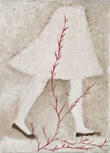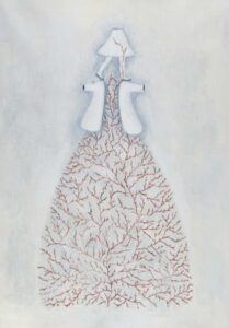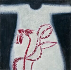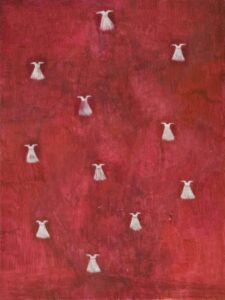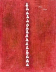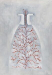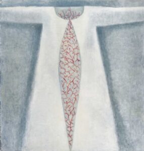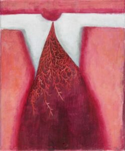 “Una serie entrincada de nervaduras rojas, una ramificación obsesiva como un bordado, como el enmarañado tejido de un árbol: rojo sangre, tanto, que en un primer momento me sorprendió no encontrar una representación dramática en estas obras de Lucy Jochamowitz. Es la costumbre que nos condiciona, desencadena mecanismos internos en la mente, asociaciones no verificables y verdaderas. Al primer impacto, mirando el rojo difundido me suscitó inmediatamente pensar en un drama, en la representación trágica de un gesto violento. Nada mas equivocado es el caso de la pintura de Lucy, donde el rojo, color omnipresente, lleva en sì el pensamiento de la vida, la sangre que corre veloz, invasora y enérgicamente. Yo siempre he asociado aquel color y aquel fluido al resultado de una herida. Recuerdo la turbación de niño cuando descubrí la existencia del ciclo menstrual femenino: flujo de sangre que no podía ser sino el resultado de un contraste, un desgarre, cuando representaba en realidad la señal mas palpable y natural de la vida, de su trasmisión, aquel donde Lucy Jochamowitz es ninfa en continuo movimiento, signo inconfundible de vitalidad, por lo cual símbolos, mitos y tradiciones se presentan a la mente, son evocados y se confunden: pienso en los testimonios rupestres donde las figuras toman vida del color rojo y como los neandertales parece tuvieron la costumbre ritual de esparcir a sus muertos con materiales de color rojo, casi en el tentativo extremo de cancelar la palidez de la muerte……