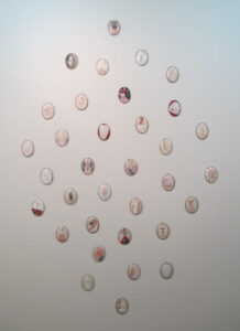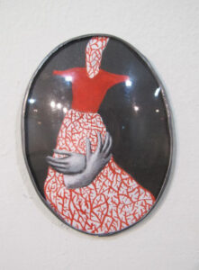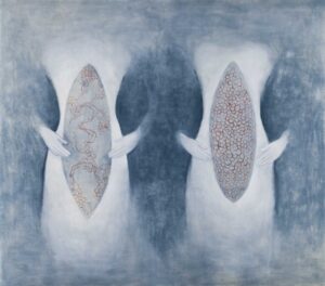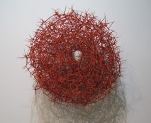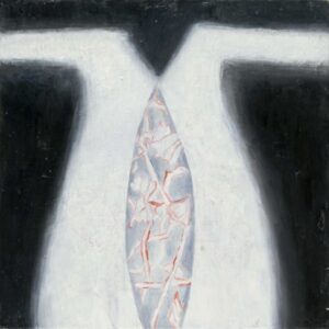 Siempre la misma idea de renovación en las grandes aberturas recurrentes en los trabajos de Lucy Jochamowitz: abertura como una herida, como una almendra, la misma que es usada por una cierta tradición que muestra un contenido valioso defendido por una envoltura durísima casi impenetrable. Vagina estilizada, perfecto ciclo completo insondable, guardián de secretos eternos como aquel justamente de la Madonna sobre la Puerta de la almendra en la catedral de Florencia.