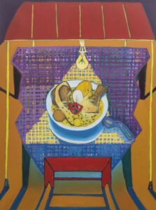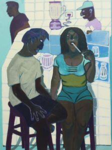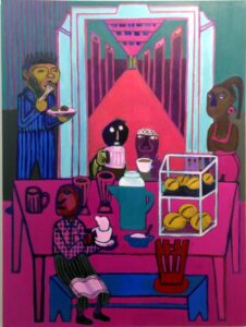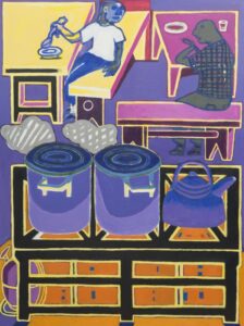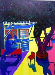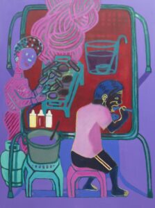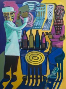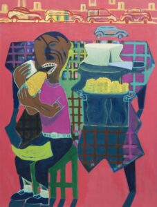 Los colores planos, la perspectiva por superposición y el uso de diagonales en la composición recogen esa estridencia y amontonamiento típicos de la capital peruana. Pero en medio de la vorágine los personajes hacen una pausa y se comunican, hablan, recuperan el contacto humano más primario.