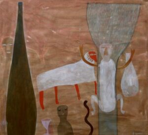 Giorgio se maneja dentro de un lenguaje metafórico, poblando sus composiciones con una simbología muy personal, mesas, jarros,  animales, personajes fragmentados, un elenco numeroso de presencias y objetos rebelados que cohabitan a plenitud en una suerte de ” paraíso plástico”, todo dentro de una caótica armonía, gozando con lo sugestivo que resulta de lo no tan definido, invitando a cada espectador a ver lo que su potencial visual puede percibir.