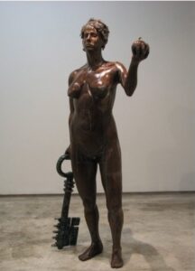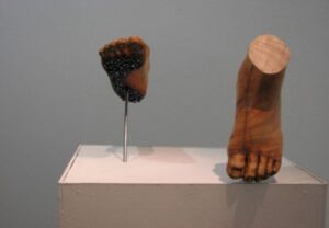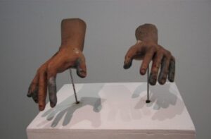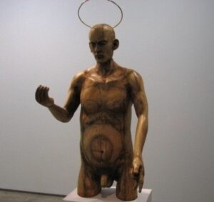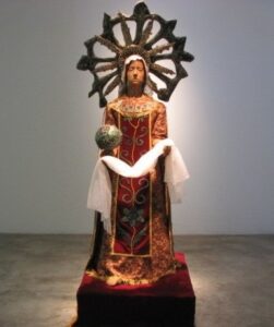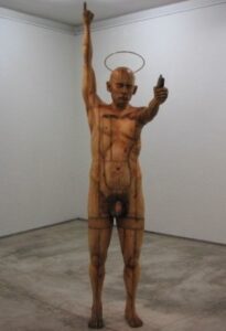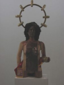 Estupenda exposición de esculturas a la que el artista ha llamado “Technoparanoia celeste”, demos un pequeño vistazo a la personal lectura que el artista realiza sobre la muestra: ….La Exposición “Technoparanoia celeste” nace a partir de mi cuestionamiento sobre la invasión de la vida artificial en nuestra existencia. Esta reflexión crítica plantea la posibilidad de una nueva sagrada familia desacralizada por la tecnología. A simple vista pueden parecer imágenes religiosas pero esta serie de esculturas, que forman un “panteón de santos”, no es otra cosa que una mirada irrisoria del reflejo de nuestra sociedad, en la que prima una espiritualidad tecnológica. Para esta muestra presento una serie de ocho piezas. Las esculturas tienen movimiento en determinadas partes del cuerpo, dándole importancia a una acción, como por ejemplo: el movimiento de los pies que nos recuerda la procesión lenta, fatigante y penitente, el movimiento de los ojos que nos hace pensar en el éxtasis, o el movimiento de las manos como imposición. Mis materiales son básicamente componentes electrónicos de las computadoras para manifestar la intrusión de la vida artificial en nuestra vida humana: los circuitos electrónicos incrustándose en la piel o el plomo mezclándose en nuestra sangre, una suerte de nuevo hombre-máquina. Esta muestra tiene mucho de sarcasmo. Los iconos religiosos han sido desplazados para dar lugar a la adoración de los objetos de nuestra vida cotidiana: el celular, las computadoras, las llaves USB, etc. Éstos son nuestros nuevos y verdaderos objetos sagrados, nuestros objetos de adoración”.